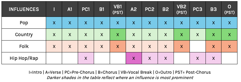 Country influences are also prominent throughout, predominantly showcased in the vocals. Shaboozey’s vocal performance includes a southern twinge, and the lyrics include references to “two-steppin’ on the table” and “a party downtown near 5th Street.” In addition, the use of acoustic and pedal steel guitars, banjo, and the fiddle in the song’s main “hook centers” (chorus 3 and post-choruses), heightens its country appeal.