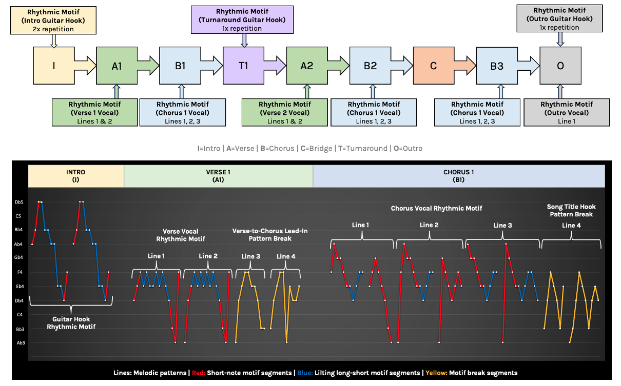 As the pattern continues to return in new forms, the song feels increasingly familiar and cohesive, strengthening its hold over repeated listens. Just as importantly, it does not simply repeat the motif mechanically: by strategically breaking from it at pivotal moments, the song heightens engagement and gives major lyrical payoffs - especially the “He’s choosin’ Texas, I can tell” hook - added impact. In that sense, the motif does more than enhance flow and memorability; it helps shape the song’s core identity.