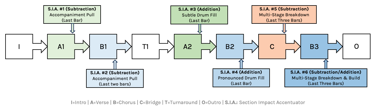 From brief instrumental pullbacks to multi-stage breakdowns, “Choosin’ Texas” leverages six distinct S.I.A.s across its verses, choruses, and bridge - each carefully crafted to enhance engagement, avoid predictability, and deliver the song’s most powerful moments with precision.