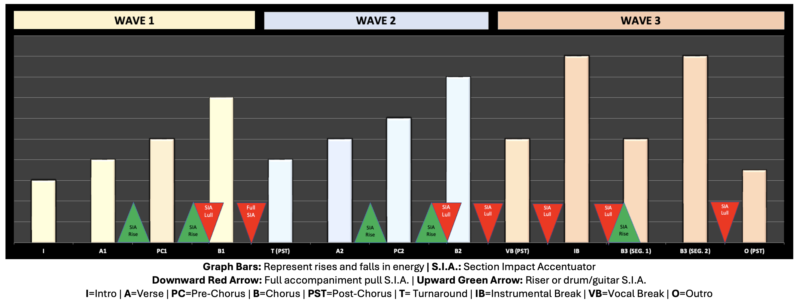 The above energy wave chart visually highlights how these rises and lulls are strategically placed to maximize impact - with the tallest peaks corresponding to the choruses and instrumental break, and the lower points marking moments of intimacy and space.