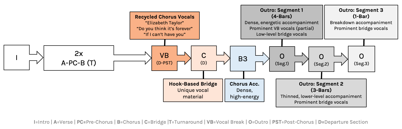 Co-written and co-produced by Taylor Swift, Max Martin, and Shellback, “Elizabeth Taylor” features an expertly crafted three-segment outro that reimagines existing chorus, post-chorus, and bridge material in evolving contexts.