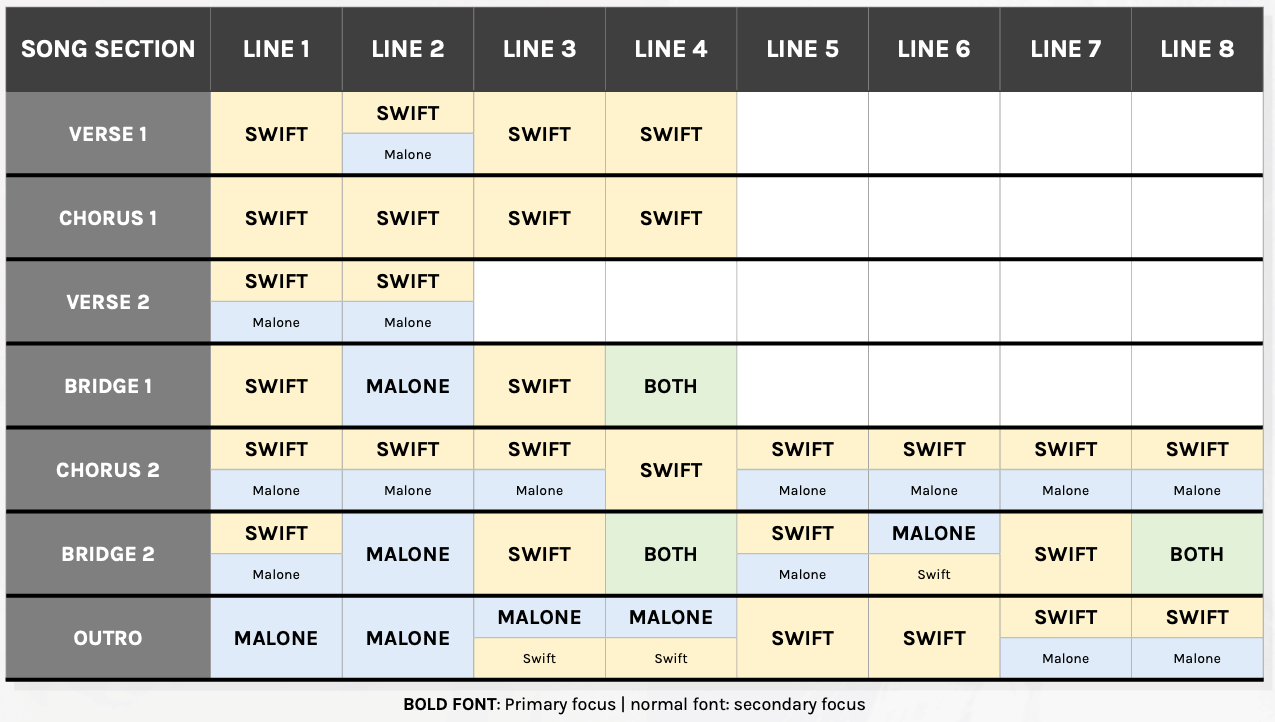 As you can see, Taylor Swift and Post Malone are strategically featured in both lead and background vocal capacities over the course of the song. This vocal interplay not only enhances listener engagement but also adds layers of narrative depth to the song.
