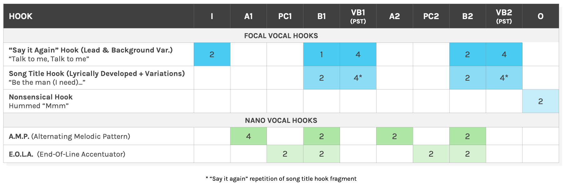 The track combines multiple hook types -including three “Focal” vocal hooks (the standout focal points of a section), two “Nano” vocal hooks (subtle catchy embellishments) and call-and-response interplay - all expertly integrated to reinforce one another. The result is a cohesive, multi-hook framework that evolves while maintaining instant recognizability.