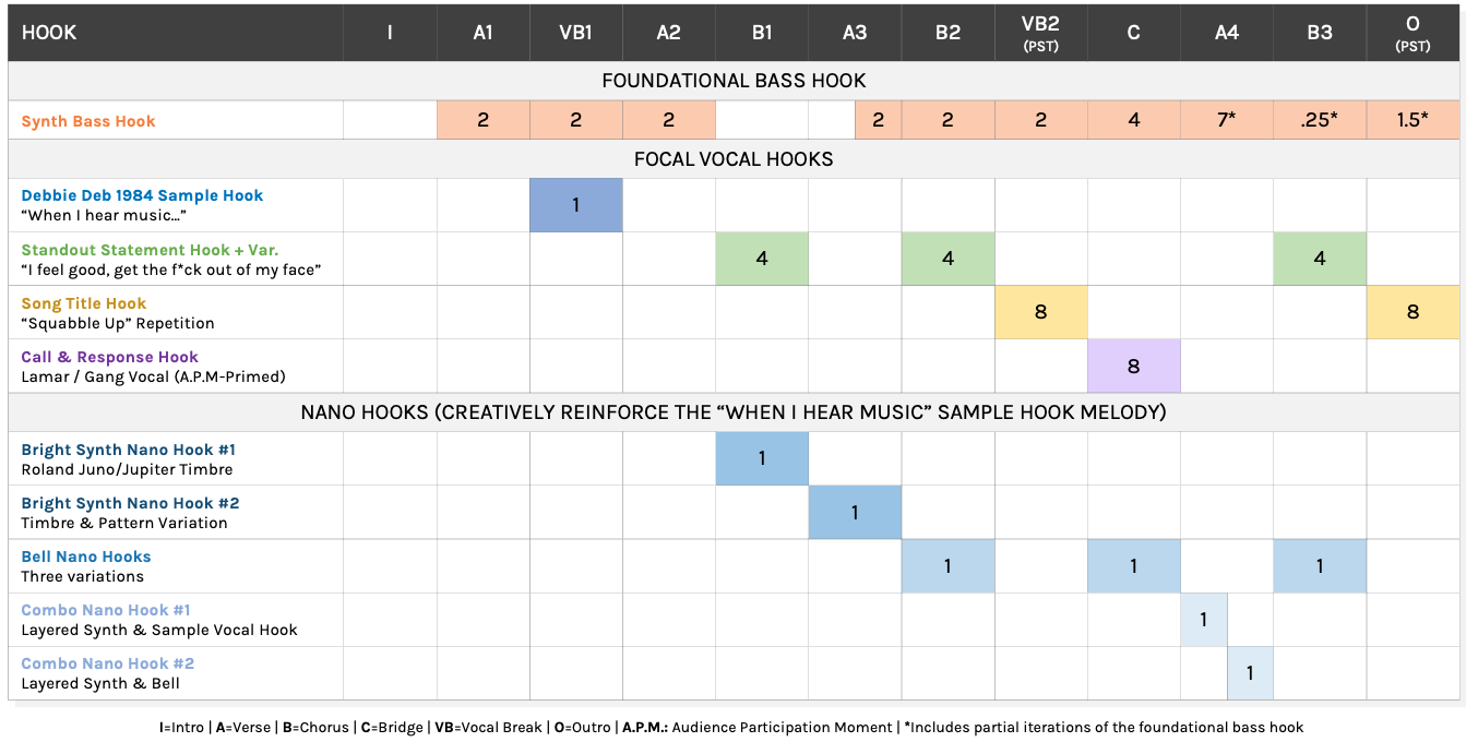 Subscribers can discover how each of “Squabbled Up’s” hooks are methodically arranged within and across sections to heighten catchiness, engagement, and memorability by clicking here.