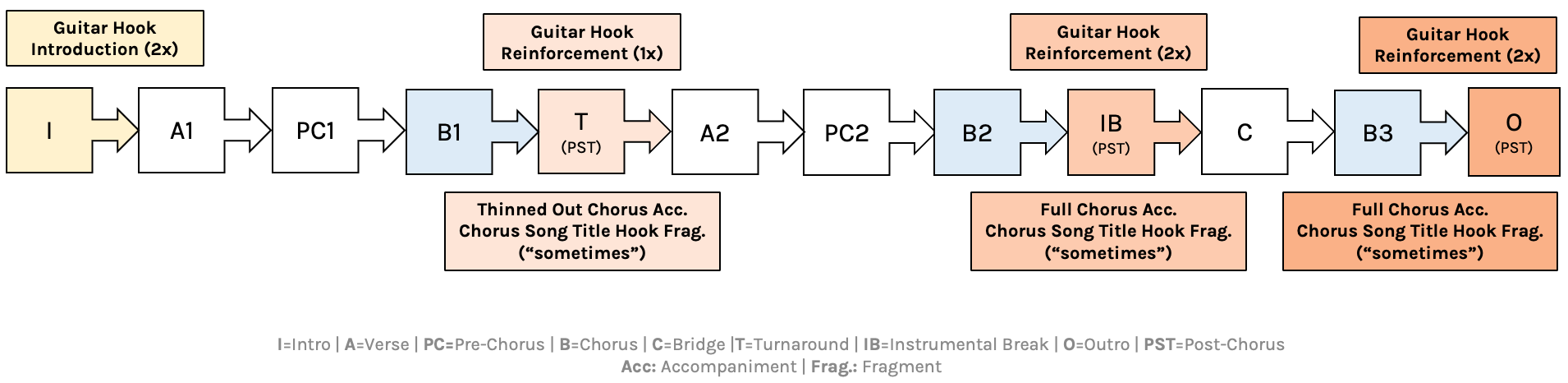 While each post-chorus serves a different role within the broader structure, they all share a unifying purpose: reinforcing the electric guitar hook introduced in the intro alongside a fragment of the summative title hook—“But superman is still just a man sometimes”—that closes each chorus.