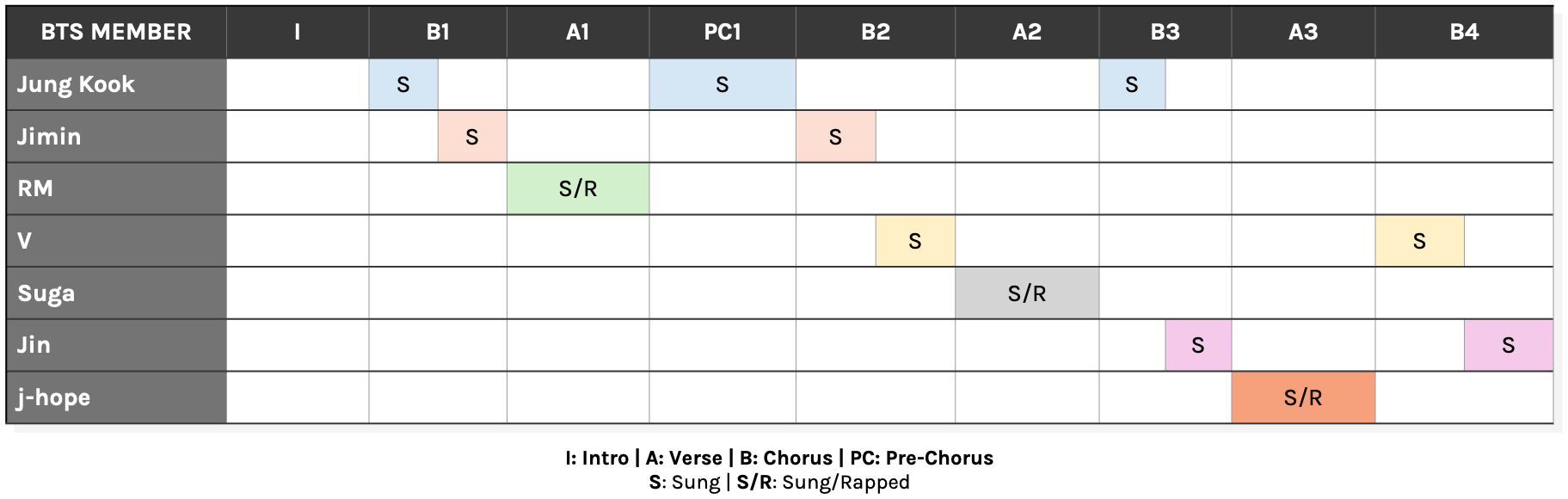 The song alternates between entirely sung, duet-based choruses and single-member sung/rapped hybrid verses, with Jung Kook’s standalone pre-chorus providing an additional point of contrast between the two.