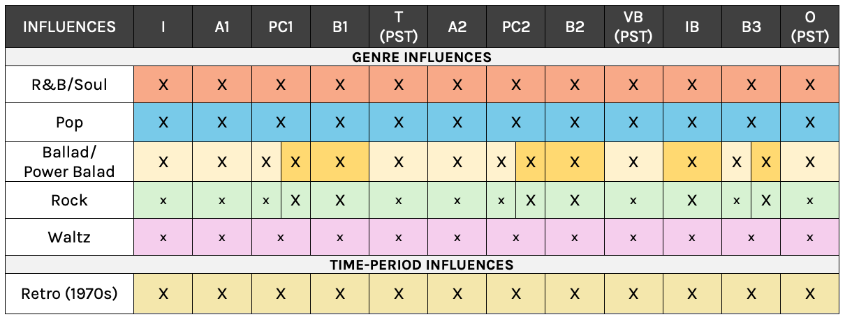 The chart above visualizes the song’s genre and influence DNA across its key sections. We see consistent throughlines of notable R&B/soul and pop influences, while prominence variations in ballad, rock, waltz, and retro 1970s influences are more selectively deployed to heighten musical and emotional contrast throughout the arrangement. This genre sequencing is a vital component of the song’s arc, allowing each section to build or pivot with intent.